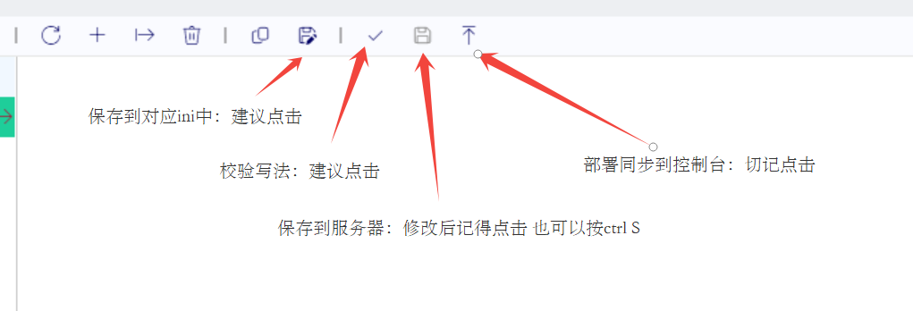 ini# 关于复制粘贴 # 对于在管理器中的配置复制,用ctrl c/v 没有作用,在顶上图标中有一个[复制当前配置内容],鼠标放上去悬浮可以看到信息,该图标点击后可以将当前页面所有配置信息全部复制下来,在其他配置中可以直接全部粘贴,但是是全部的配置信息,不利于复制指定配置,建议可以在ini文件打开后进行粘贴复制或者在管理器中利用首页配置若在配置管理器中添加/修改某个配置信息后,请将下列图标依次点击一次